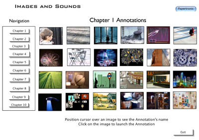Images & Sounds Audiovisual Language comprises 9 chapters and 140 converged audiovisual annotations. Multi-layered with many pathways, meaning is created within paragraphs and chapters. It contains an Audiovisual Catalogue, which is the Contents page for the audiovisual annotations, organised by chapter. It is possible to navigate the text from the Audiovisual Catalogue in the Papertronic eBook.